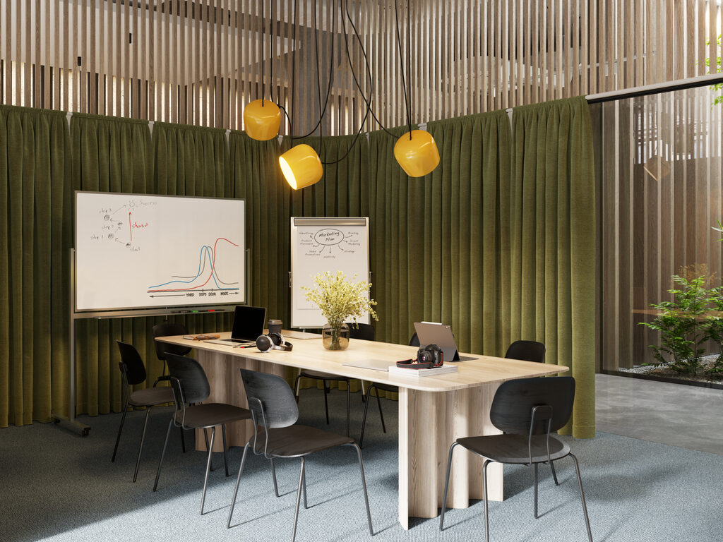 Solutions innovantes de correction acoustique : toiles et plafonds tendus, rideaux acoustiques et panneaux & objets acoustiques.